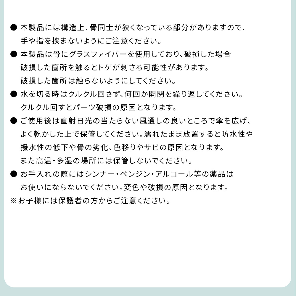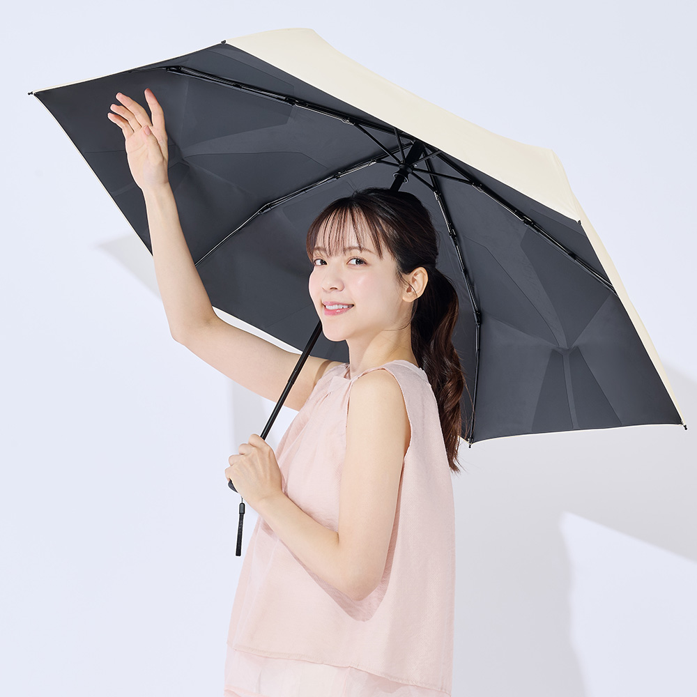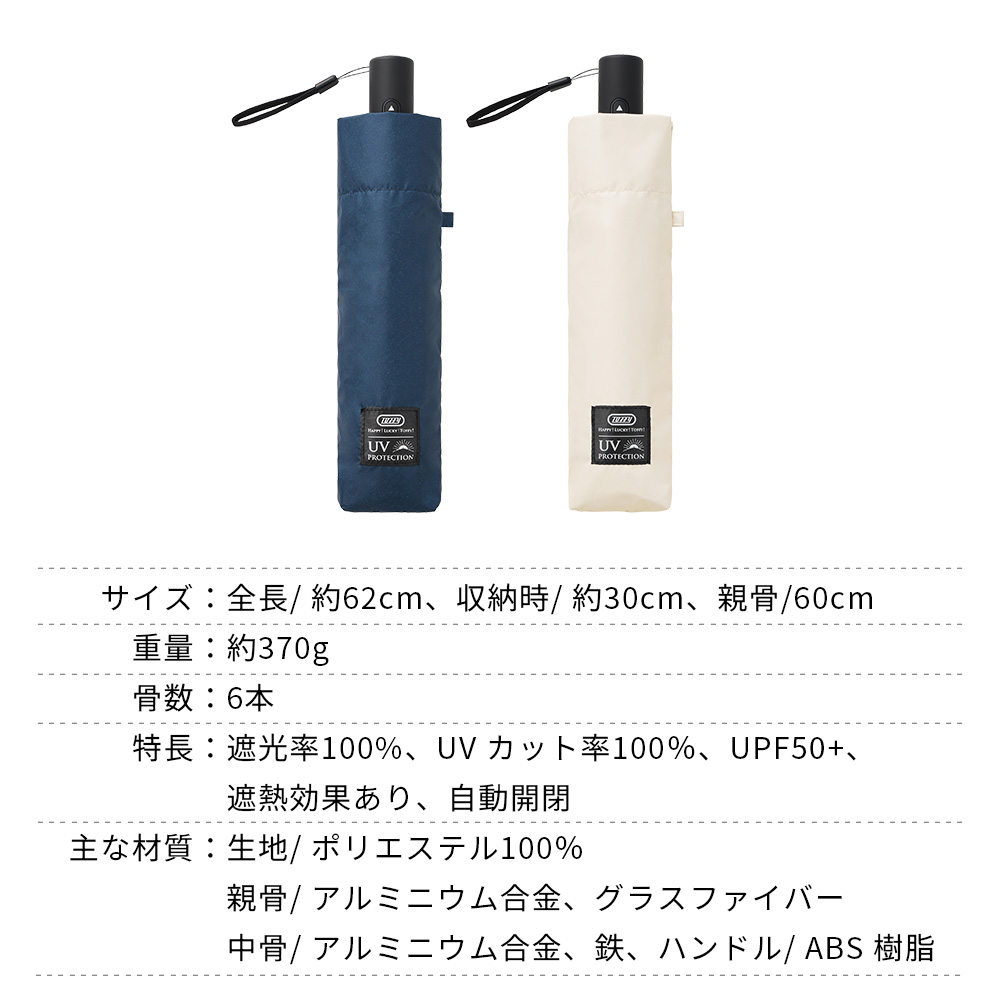サイズ:全長/ 約62cm、収納時/ 約30cm、親骨/60cm重量:約370g骨数:6本特長:遮光率100%、UV カット率100%、UPF50+、遮熱効果あり、自動開閉主な材質:生地/ ポリエステル100% 親骨/ アルミニウム合金、グラスファイバー 中骨/ アルミニウム合金、鉄、ハンドル/ ABS 樹脂