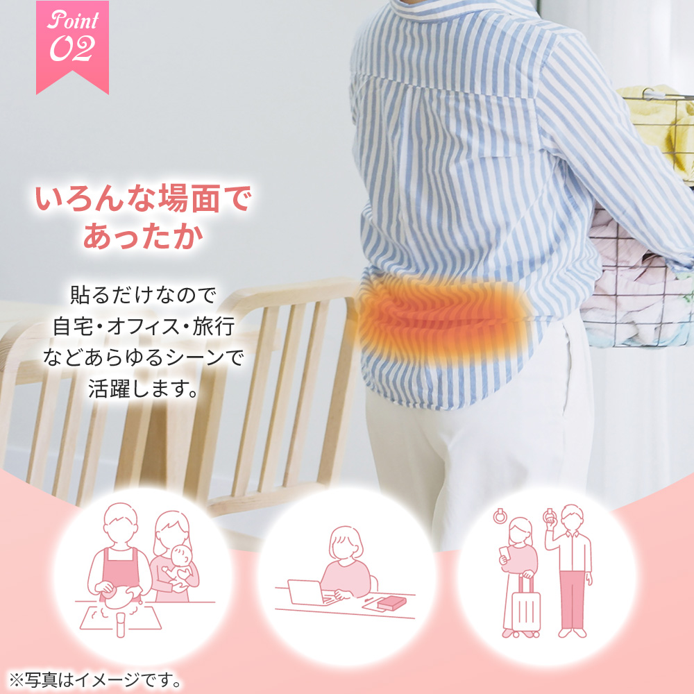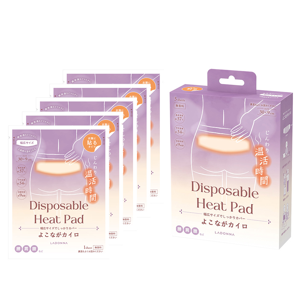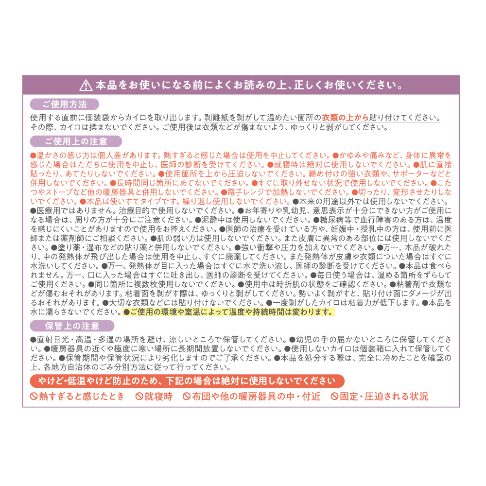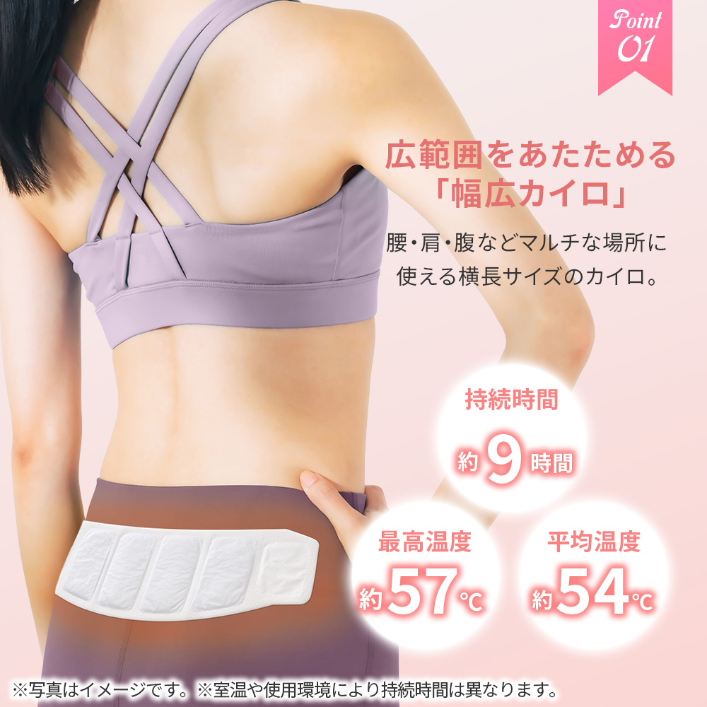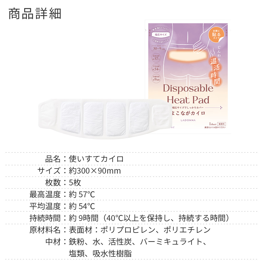品名:使いすてカイロサイズ:約300×90mm枚数:5枚最高温度:約 57℃平均温度:約 54℃持続時間:約 9時間(40℃以上を保持し、持続する時間)原材料名:表面材:ポリプロピレン、ポリエチレン中材:鉄粉、水、活性炭、バーミキュライト、塩類、吸水性樹脂