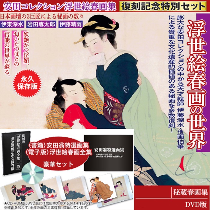 今回は待望の「安田翁特選画集より日本画壇3巨匠特集(画集)」の復刊を記念して「浮世絵春画全集一巻(DVD版・一枚)」との永久保存版の豪華セットでご提供いたします。