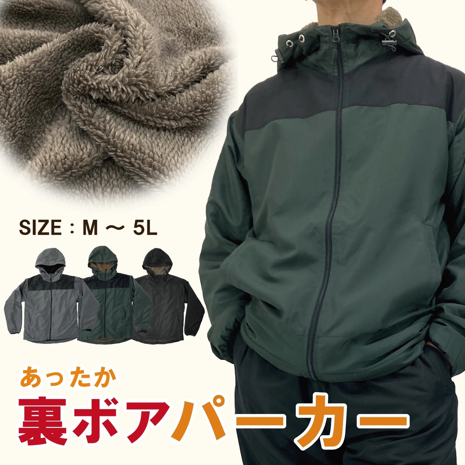 暖かい裏ボア素材でウェア内の温かさをキープし、寒い季節の外出や作業にぴったり。