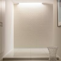 推奨工法 | 屋内壁:全面接着剤張り工法 全面接着剤張りは、タイル裏あし高さが2.0mm未満のタイルに適用します。平坦な下地に張り付け用接着剤をくし目コテ(5mmまたは3mm高さ)で塗布し、タイルをしっかりと揉み込むようにたたき押さえをして張り付ける工法です。 |