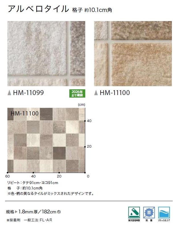 クッションフロア 1.8mm厚フロア 2色 182cm巾 アルベロタイル ストーン 塩化ビニル床シート 土足対応 サンゲツ Hフロア sangetsu H FLOOR