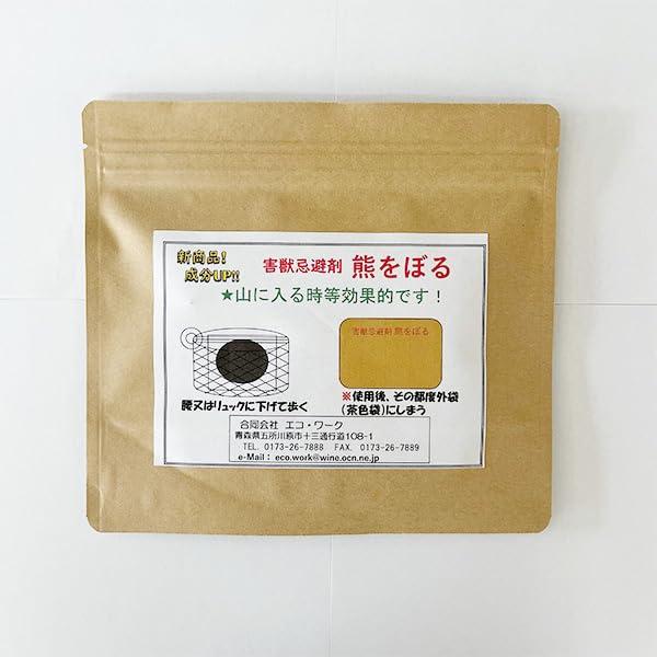 熊用忌避剤として開発された「熊をぼる」(青森県津軽弁で”追い払う”という意味です。)(旧商品名「熊にげる」)被害が発生しそうな場所や、被害が発生した場所に大変有効な忌避剤で活用ください。・【注意事項】 〇忌避剤の原液に素手で直接触らないでください(火傷のような痛みを感じる場合があります)。 〇風上には匂いが飛ばないので十分注意して下さい。 〇匂いの出る期間使うことができます。(おおよそ2か月〜3ヶ月位) ◎液だれをして衣類に着くことはありませんが、臭いが衣類に染み付くことはありますので、ご注意ください。 〇使用後は、都度外袋(付属の茶色袋)に入れてください。 〇保管等はお子様の手の届かない冷暗所に保管、管理してください。 〇本商品は、多くの農地等で忌避実証されておりますが、現地での自然環境により変わりますので被害の補償は出来かねます。【製造・販売元】合同会社 エコ・ワーク