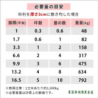 • 1平方メートルあたり、2~3cmの厚さで、約32~48kg必要です。