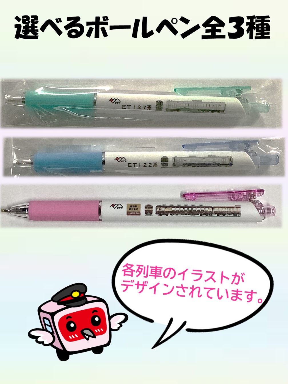 各列車のイラストがデザインされています。ノック式のボールペンになります。