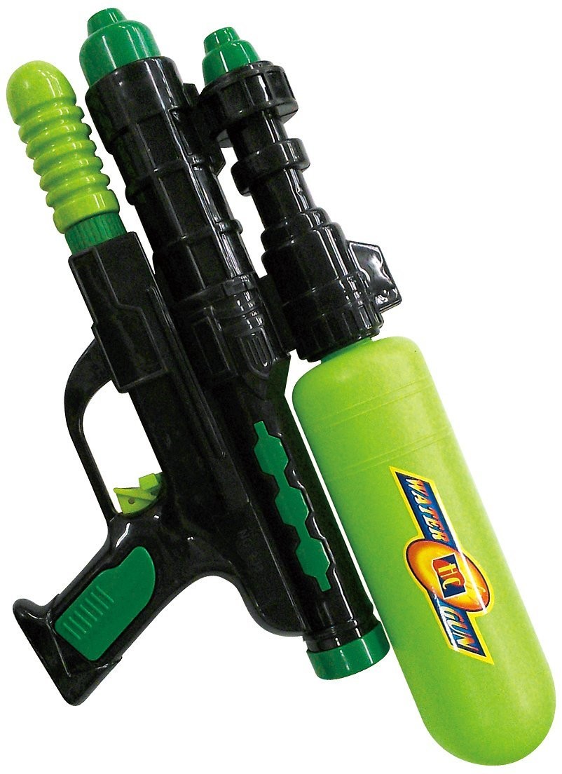 エアー圧縮式のポンプアクションウォーターガン。ツインノズルで2連発射。飛距離約6m。タンク容量500cc。濡れると色が変わるスプラッシュターゲット、タスキアーマー付き。乾けば元に戻るので何回でも使用可。