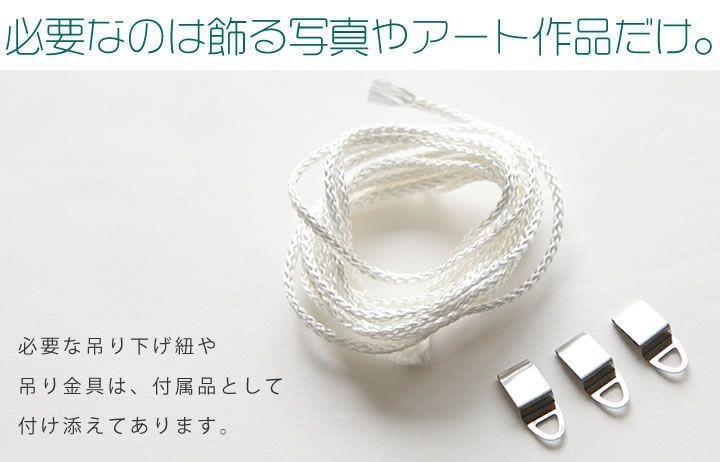 *送料を含んだ価格になっております。アート作品も映える大判サイズ。大好きなアーティストのポスターや、お気に入りのイラスト作品などを飾っても映えて、自分好みのお部屋へと変身させます。風景写真などを飾るとお部屋に奥行が生まれ、拡張効果にもつながります。タテヨコ自在。フレームは縦型にしても使えます。中に入れるアイテムによって向きを変えられるので便利。必要なのは飾る写真やアート作品だけ。必要な吊るし紐や、額縁の紐通しは付属品として付け添えてあります。裏側には向きのが分かりやすい色味のトンボ止めと、しっかりした吊り下げ金具が付いています。付属している吊り下げ用の紐。シンプルで扱いやすい。紐方向も選べるので絵柄 に合わせて付け替え可能。中敷きやフィルム、背当てもセット内容です。組合せ自由、中に入る作品によっては中敷きをそのまま使ったり、取り外したりと自由自在です。優しげな風合いのフレーム。カラーは綺麗な色を取り揃えました。
