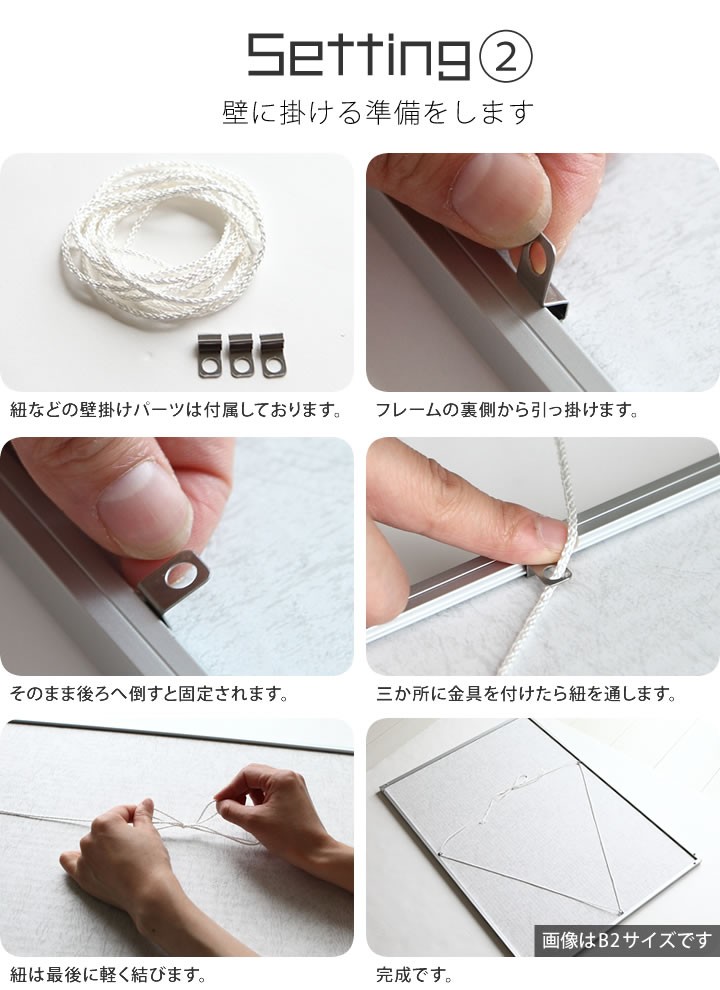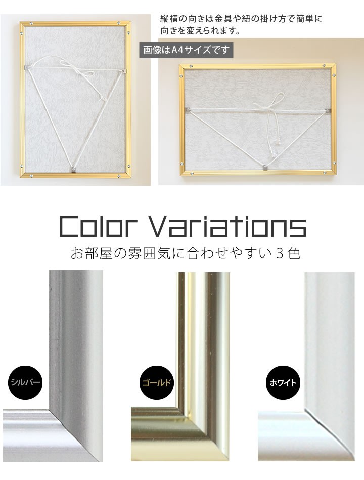 *送料を含んだ価格になっております。内訳商品販売価格に送料が含まれておりますので、送料無料表記になっております。ご了承くださいますようよろしくお願い致します。アート作品、大好きなアーティストのポスターや、お気に入りのイラスト作品などを飾っても映えて、自分好みのお部屋へと変身させます。風景写真などを飾るとお部屋に奥行が生まれ、拡張効果にもつながります。タテヨコ自在。フレームは縦型にしても使えます。中に入れるアイテムによって向きを変えられるので便利。必要なのは飾る写真やアート作品だけ。必要な吊るし紐や、額縁の紐通しは付属品として付け添えてあります。裏側には向きのが分かりやすい色味のトンボ止めと、しっかりした吊り下げ金具が付いています。付属している吊り下げ用の紐。シンプルで扱いやすい。紐方向も選べるので絵柄 に合わせて付け替え可能。中敷きやフィルム、背当てもセット内容です。組合せ自由、中に入る作品によっては中敷きをそのまま使ったり、取り外したりと自由自在です。優しげな風合いのフレーム。カラーは綺麗な色を取り揃えました。