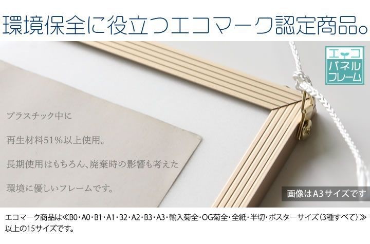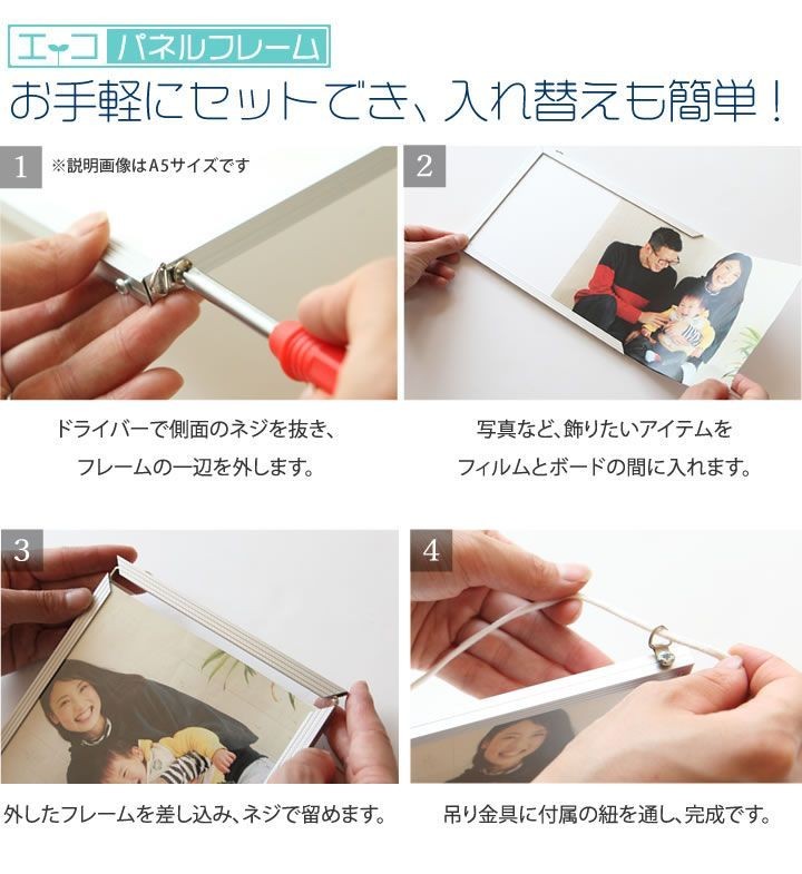 *送料を含んだ価格になっております。アート作品も映える大判サイズ。大好きなアーティストのポスターや、お気に入りのイラスト作品などを飾っても映えて、自分好みのお部屋へと変身させます。風景写真などを飾るとお部屋に奥行が生まれ、拡張効果にもつながります。タテヨコ自在。フレームは縦型にしても使えます。中に入れるアイテムによって向きを変えられるので便利。必要なのは飾る写真やアート作品だけ。必要な吊るし紐や、額縁の紐通しは付属品として付け添えてあります。裏側には向きのが分かりやすい色味のトンボ止めと、しっかりした吊り下げ金具が付いています。付属している吊り下げ用の紐。シンプルで扱いやすい。紐方向も選べるので絵柄 に合わせて付け替え可能。中敷きやフィルム、背当てもセット内容です。組合せ自由、中に入る作品によっては中敷きをそのまま使ったり、取り外したりと自由自在です。優しげな風合いのフレーム。カラーは綺麗な色を取り揃えました。
