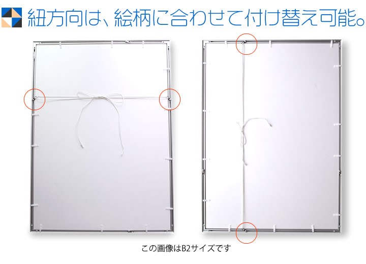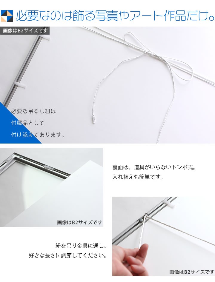 アート作品も映える大判サイズ。 大好きなアーティストのポスターや、お気に入りのイラスト作品などを飾っても映えて、自分好みのお部屋へと変身させます。 風景写真などを飾るとお部屋に奥行が生まれ、拡張効果にもつながります。 タテヨコ自在。フレームは縦型にしても使えます。 中に入れるアイテムによって向きを変えられるので便利。 必要なのは飾る写真やアート作品だけ。 必要な吊るし紐や、額縁の紐通しは付属品として付け添えてあります。 裏側には向きのが分かりやすい色味のトンボ止めと、しっかりした吊り下げ金具が付いています。付属している吊り下げ用の紐。シンプルで扱いやすい。 紐方向も選べるので絵柄 に合わせて付け替え可能。 中敷きやフィルム、背当てもセット内容です。 組合せ自由、中に入る作品によっては中敷きをそのまま使ったり、取り外したりと自由自在です。優しげな風合いのフレーム。カラーは綺麗な色を取り揃えました。