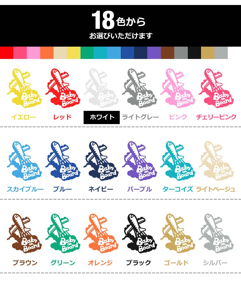 イエロー(黄色) / レッド(赤) / ホワイト(白) / ライトグレー(灰色) / ピンク(桃色) / チェリーピンク(濃桃色) / スカイブルー(水色) / ブルー(青色) / ネイビー(紺色) / パープル(紫色) / ターコイズ / ライトベージュ / ブラウン(茶) / グリーン(緑) / オレンジ(橙) / ブラック(黒) / ゴールド(金) / シルバー(銀)