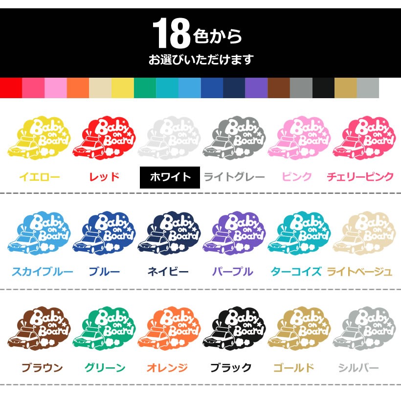 イエロー(黄色) / レッド(赤) / ホワイト(白) / ライトグレー(灰色) / ピンク(桃色) / チェリーピンク(濃桃色) / スカイブルー(水色) / ブルー(青色) / ネイビー(紺色) / パープル(紫色) / ターコイズ / ライトベージュ / ブラウン(茶) / グリーン(緑) / オレンジ(橙) / ブラック(黒) / ゴールド(金) / シルバー(銀)