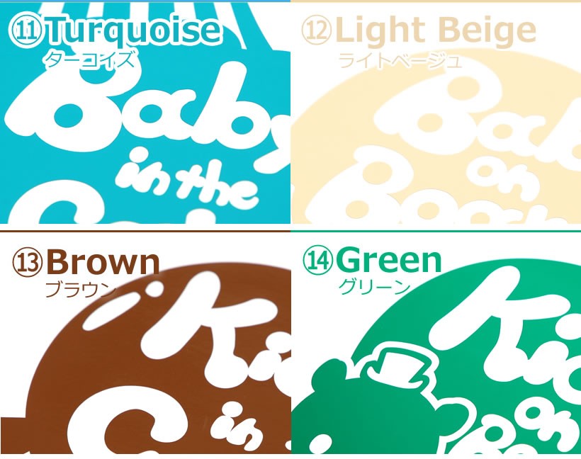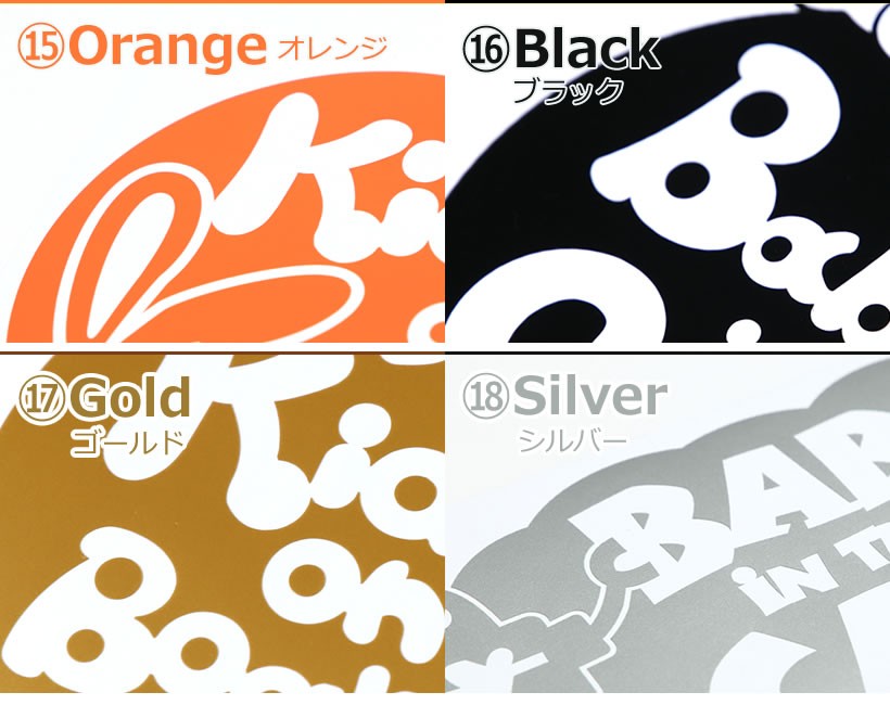 イエロー(黄色) / レッド(赤) / ホワイト(白) / ライトグレー(灰色) / ピンク(桃色) / チェリーピンク(濃桃色) / スカイブルー(水色) / ブルー(青色) / ネイビー(紺色) / パープル(紫色) / ターコイズ / ライトベージュ / ブラウン(茶) / グリーン(緑) / オレンジ(橙) / ブラック(黒) / ゴールド(金) / シルバー(銀)