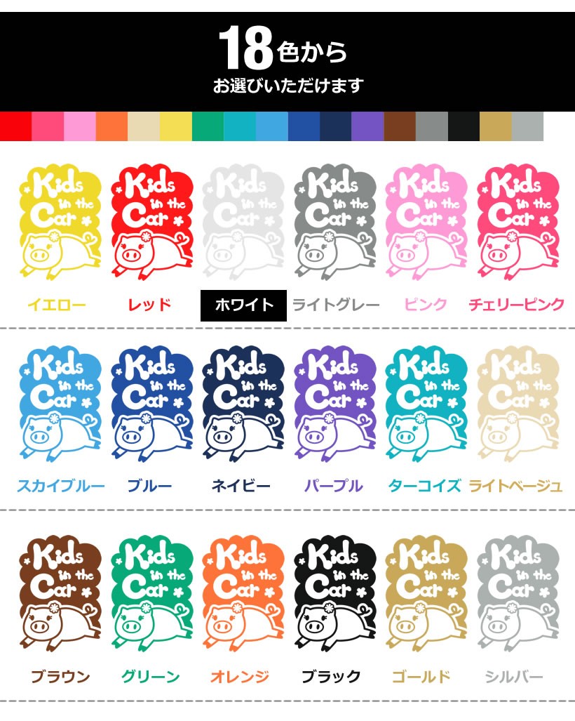 イエロー(黄色) / レッド(赤) / ホワイト(白) / ライトグレー(灰色) / ピンク(桃色) / チェリーピンク(濃桃色) / スカイブルー(水色) / ブルー(青色) / ネイビー(紺色) / パープル(紫色) / ターコイズ / ライトベージュ / ブラウン(茶) / グリーン(緑) / オレンジ(橙) / ブラック(黒) / ゴールド(金) / シルバー(銀)