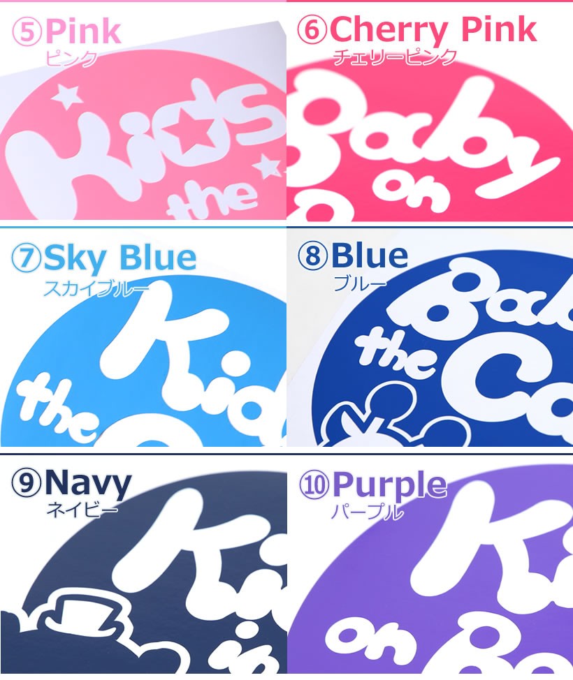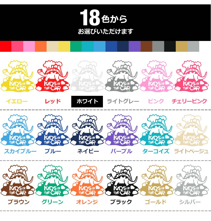 イエロー(黄色) / レッド(赤) / ホワイト(白) / ライトグレー(灰色) / ピンク(桃色) / チェリーピンク(濃桃色) / スカイブルー(水色) / ブルー(青色) / ネイビー(紺色) / パープル(紫色) / ターコイズ / ライトベージュ / ブラウン(茶) / グリーン(緑) / オレンジ(橙) / ブラック(黒) / ゴールド(金) / シルバー(銀)
