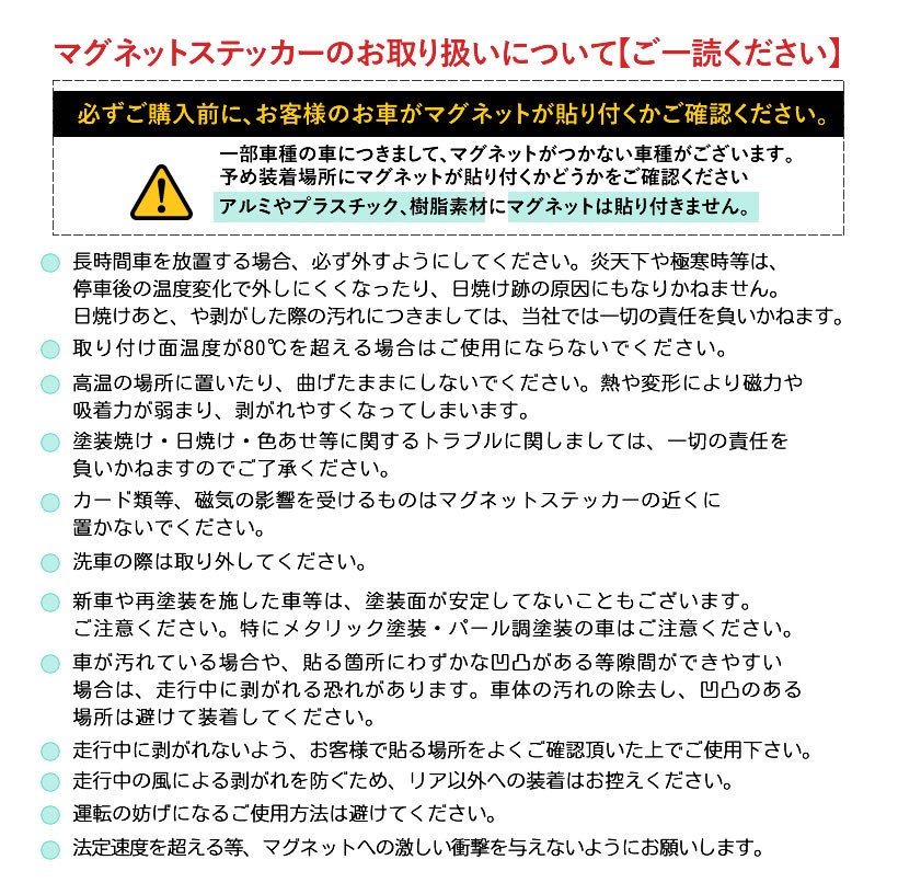 ●ボンネットや塗装があるものに貼る場合、日焼けやのり跡、塗装の剥がれなどが予想されます。貼った後に生じるこれらにつきまして、当店では一切責任を負いませんので、粘着力などをお確かめの上、お客様の自己責任にてご使用ください。