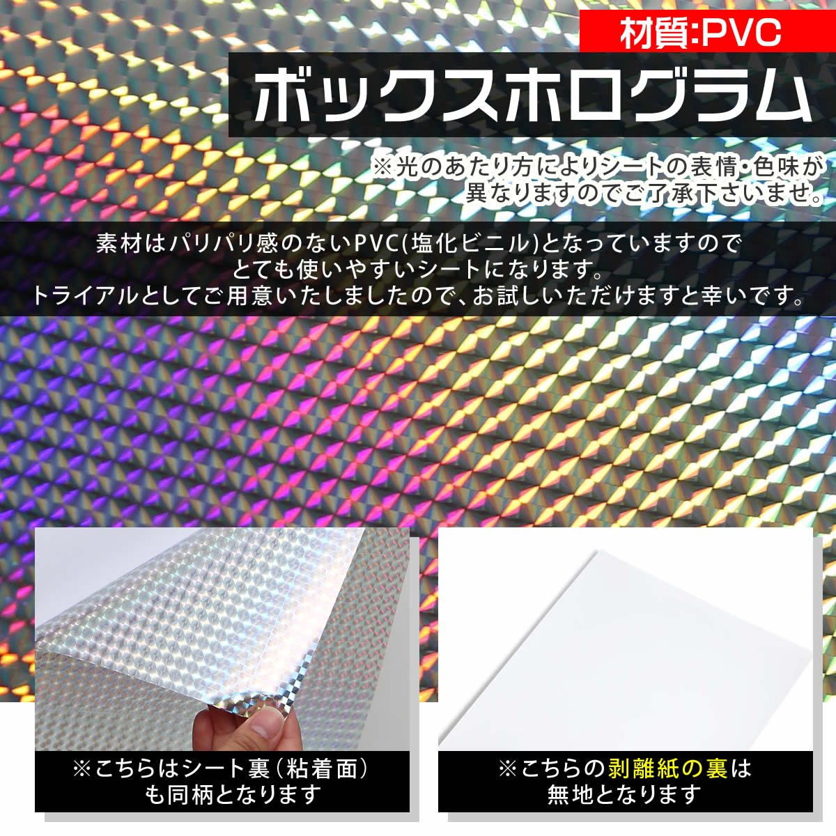 | 材質 | PET(ポリエステルフィルム)※伸縮性なし / PVC(塩化ビニル) 見た目の輝きはどちらもホログラム特有のキラキラ感がありますが、「硬さ」と「曲げやすさ」が一番の違いになります。 【PET】ハリがありしっかりした質感。シャープで高級感のある輝きが特長です。 【PVC】やわらかくしなやか。曲面にも貼りやすく、扱いやすい素材です。※ボックス柄のみの販売となります |