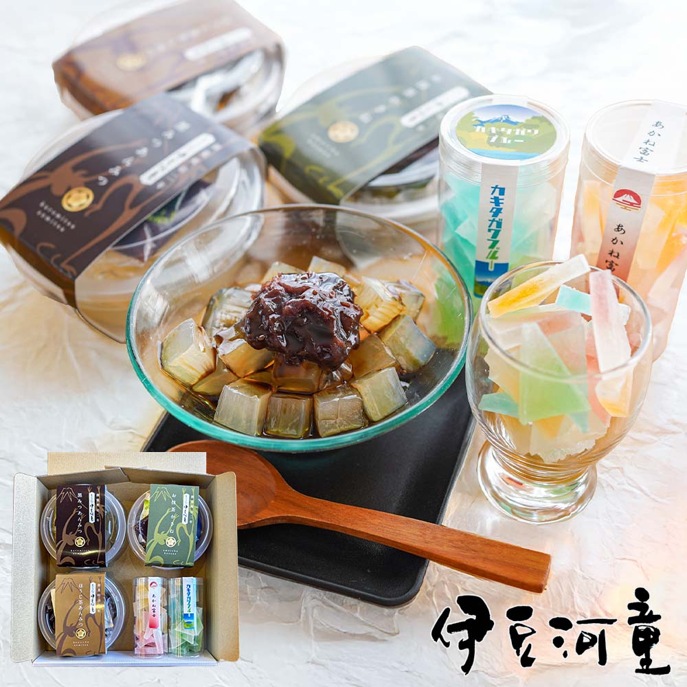 創業明治2年、本場伊豆で伊豆天草100%で昔ながらの製法で作るところてんを角切りにしました。一般的な寒天よりも、コリコリとした食感、さわやかな磯の香りがします。