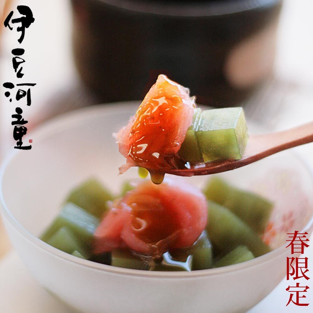 ふんわりと咲いた桜の花を思わせる、桜餡。塩漬けにした桜の葉を、細かく切って、混ぜ込んであります。甘さの中にほんのりと塩味が、餡のおいしさを引き立てています。伊豆河童のところてんからつくるあんみつに、ぴったりと合う餡を、京都の老舗の製餡所で作っています。
