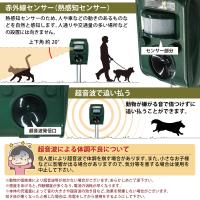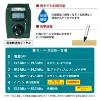 改良版登場! 改良点は4つ 1.内部構造の改良により防水性能がアップ。 それによる長寿命化も実現しています。 2.超音波の性質がアップ。 従来品の60dBから80dBに向上しています。 3.LEDチップの改良 STMタイプのチップを搭載。 これにより、安定発光と長寿命化を実現。 4.超音波と警告音で効果的に害獣を撃退! ※警告音発生時は超音波は出ません。同時にご利用の場合は 複数台設置などでご対応ください。 音波や光で動物をよせつけない! 2つのコントロールボタンでセンサー感知範囲設定 稼動モードの選択が可能です 動物を怪我させずに追い払うソーラー式ガーディアン 防滴構造で雨天使用可能 土面に突き刺すか置いたり掛けたりできる簡単設置です。 太陽光パネル搭載のソーラー式だから 配線や電源の心配をする必要もいりません。 商品サイズ:(約)12.9×9.6×9cm 高さ:38cm 重量:350g 感知距離 8m / 110°/ 水平 (天候により変動) 防水等級:IPX4 電源 ソーラーパネル:充電式電池 800MA (3×AA 1.2V)付属 ※動物の個体差や環境の違いにより効果が見られない場合がございます。予めご了承ください。 ※動物による危害や天災などの外的要因による破損・不具合などについては保証の対象外となります。 ※充電がない状態で長時間保管しないでください。保管する前に満充電にしてください。 ※長時間保管する場合は約3~6か月ごとに満充電していただき完全放電することを防いでください。 ※完全放電してしまうとバッテリーへの充電ができなくなり、使用できなくなる恐れがございます。 付属のバッテリーは、軽量でありながら高電圧かつ大電力なため、 取扱いを誤ると発熱によってやけどを負うこともあり、場合によっては事故につながることもあります。 下記注意事項をご確認の上安全にご使用いただきますようお願いいたします。 (2)製品本体を落下させるなどで強い衝撃、圧力を加えない、高温の環境に放置しないようにしましょう。 (3)充電中は周囲に可燃物を置かないようにしましょう。 (4)バッテリー部分や充電端子が膨らんでいる、熱くなっている、変な臭いがするなど、いつもと違って異常を感じたら使用を中止しましょう。 (5)充電器の定格出力を確認し、接続する機器の仕様に応じて適切な充電器を使うようにしましょう (6)放熱が妨げられる環境下で使用すると高温になるおそれがあります。使用中や充電中は発熱することを認識しておきましょう (7)充電コネクタの破損や水ぬれに注意しましょう。 (8)使用済みバッテリーを廃棄する際はリサイクルに出しましょう。 やむを得ず廃棄する際には他の家庭ごみと区別して出しましょう。 |