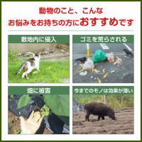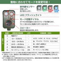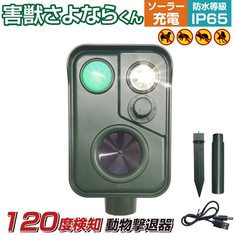 最新改良版登場! ●改良点は 1.防塵・防水等級IP65で既存製品よりパワーアップ、粉塵・小雨や水滴に対応できます。 ※横殴りの大雨など天候が著しく悪い場合は直撃しない場所に移動お願いします。 2.取り付け支柱2本分付属、田んぼ、畑や庭などで簡単取付可能! 3.ソーラーパネル付きでソーラー充電ができ、天気の悪い日が続く場合、付属のUSBケーブルを使用しても充電ができます。 4.様々の侵入動物に対応可能の複数モードが備えられています。 5.夜間の害獣よけに効果があるフラッシュライト付き。 【製品紹介】 5つの稼動モードの選択が可能、超音波作動、警告音作動、フラッシュ作動できます。 動物を怪我させずに追い払うソーラー式ガーディアン。 防滴・防塵構造で雨天使用可能。 土面に突き刺すだけで簡単設置です。 太陽光パネル搭載のソーラー式だから設置して使用しながら充電ができます。 配線や電源の心配をする必要もいりません。 USB充電コードが付属しており、天候不良やバッテリー容量低下時は室内の充電も対応できます。 【主な商品仕様】 型番:aut-069 製品名:害獣さよならくん 本体サイズ(約):縦13cm(37cm※)×横8cm×奥行6.3cm ※()内の縦幅は支柱取り付け済み時の最大値の高さです。 本体重量(約):177g(内蔵バッテリー含む) 内蔵バッテリー:リチウムイオンバッテリー(3.7V/1200mAh) 充電方法:ソーラーパネル充電/USB充電(入力定格5V/1A) 充電目安時間(約):ソーラーパネル充電2.5日間/USB充電3.5〜4時間 ※充電時間はあくまでも目安です。ご使用の環境により異なります。 センサータイプ:受動赤外線センサー(PIR感知式) センサー感知角度(約):水平120°(※天候・動物の種類により変動) 上下50°(上:25°/下:25°)(※天候・動物の種類により変動) センサー感知距離(約):直進最大距離8m(※設置環境により変動) 周波数帯(約):13〜45.5kHz 防水等級:IP65 使用環境温度:-10〜50℃ 素材:ABS樹脂 保証期間:ご購入日から6か月間 初期不良対応期間:ご購入日から14日間 製造国:中国 内容物:本体/支柱×2(組立て式)/USB充電ケーブル(ACアダプターなし)/日本語取扱説明書 防水等級:IP65について ※「粉塵が完全に入らず、あらゆる方向からの水の噴射にも耐えられる」レベル 水没の恐れがある場所、強烈な雨時でのご使用は漏電を起こす可能性があるため危険です。 事前に取り外すなどの対策をしてください。 【ご使用について】 ●ご使用の前に付属の取り扱い説明書を熟読し、機器の知識・安全の情報そして注意事項について習熟してから正しくご使用ください。 ●商品改良のため、仕様・外観は予告なく変更する場合があります。また実物は写真と異なる場合がありますので、あらかじめご了承ください。 ●輸送時の擦れや細かなキズがある場合がございます。必ずご理解の上ご購入ください。 ●画像はモニターにより色あいが違って見える場合がございます。また一部イメージ画像を使用しております。あらかじめご了承ください。 ●ご注文の際は、お買い物ガイドをよくお読みの上でご注文いただきますようお願い申し上げます。 【使用時の注意事項】 ※動物の個体差や環境の違いにより効果が見られない場合がございます。予めご了承ください。 ※動物による危害や天災などの外的要因による破損・不具合などについては保証の対象外となります。 ※個体差により超音波で体調を崩された場合にはただちに使用を中止してください。 ※本製品は熱感知の赤外線センサーを使用しております。稀に動物以外に反応してしまうことや、 光や温度に反応してしまう場合があります。 ※熱感知の為、動物の部位によってはセンサーが反応しずらい場合があります。 できるだけセンサーが対象の全身を捉えるよう設置してください。 ※対象が素早すぎる、センサーに対して直進的に動くといった場合は赤外線センサーが検知しきれない場合があります。 ※熱源に反応するため対象との間にガラスなどの遮蔽物がある場合は検知できません。 また赤外線センサーのレンズを覆わないでください。 ※暴風雨などの恐れがある場合のご使用をお控えください。 ※感知範囲、または本体設置場所の周囲でペットが遊んでいる場合は、本機の電源をお切りください。 ※設置は必ず敷地内で内側に向けて設置してください。 ●充電時の注意事項 当商品は、充電式ですので蓄電池を内蔵しております。 また、輸入品になりますので、保管期間が長い商品の場合 内蔵の蓄電池の電池残量が少なくなっている場合がございます。 電池残量が極度に少ないと、本来の性能を発揮できない場合がございます。 はじめてご使用いただく際に、設置したものの機能しないなどの 症状がみられた場合、一度電源をオフにしていただきまして、 日当たりの良いところで2,3日充電してみてください。 ある程度の電池残量が溜りますと、きちんと充電しながら 本来の機能が働くようになります。 また、天候などの影響で十分に充電がなされず、 電池残量が低下してしまった場合
