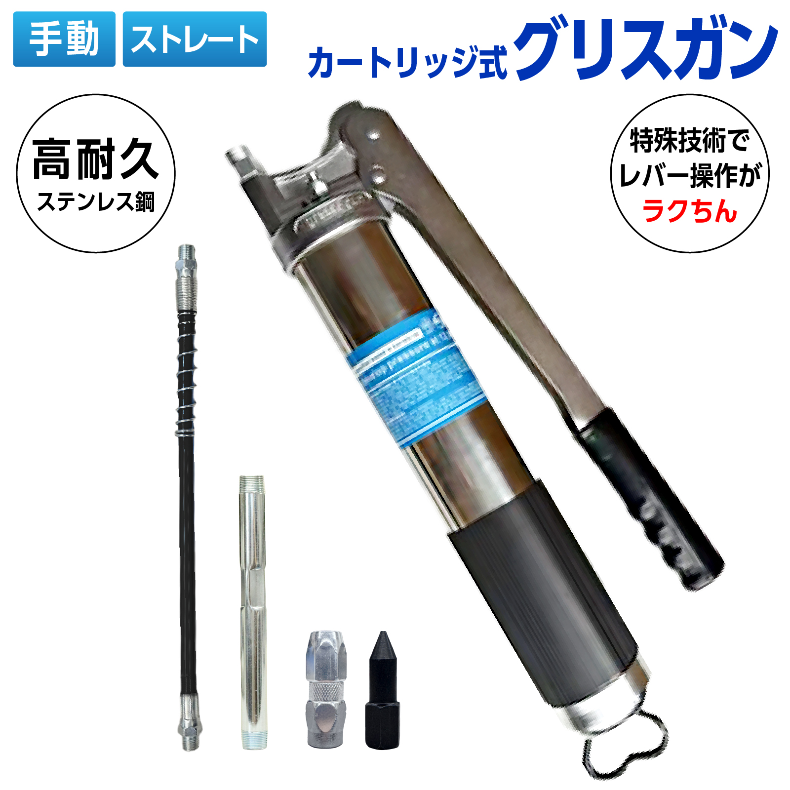 【特殊技術で簡単操作】 レバーのベアリング部分に特殊技術を採用。 力がいるレバー操作が簡単操作可能に。 【軽くて丈夫なステンレス鋼】 高品質なステンレス鋼を採用。 軽量ながら頑丈なため安心して長期間使用できます。 【握りやすい凹凸ハンドル】 落下事故を防ぐためにハンドルに凹凸滑り止めを採用。 【柔軟性に富んだフレキシブルホース】 約29cmの軽量柔軟フレキシブルホースを同梱しておりますので狭いスペースや高所への作業に最適です。 【多彩な用途に対応】 自動車や建設機械、工業機械など様々な用途に対応。 ご家庭やお仕事の現場でも大活躍。 【使用方法】 1.グリスガンにノズルもしくはフレキシブルホース及び先端アタッチメントを取り付ける。 2.先端を、注油が必要な箇所(ニップル)に押し込んで取り付ける。 3.ハンドルを握りこんで注油を行う。 【充填方法】 1.本体を回して装填用パイプを取り外す。 2.取り外した装填用パイプのチェーンを引っ張ってロックをかける。 3.本体に市販のカートリッジを取り付ける 4.装填用パイプを取り付けてロックを解除する。 品番 :diy-082 本体サイズ(約) :全長 38cm / ハンドル 33cm 本体重量(約) :1.5kg 容量(約) :400cc 付属品長さ(約) :ノズル 15cm / フレキシブルホース 29cm 対応ニップル :M6/M8/M10/M12/M14 吐出量(約) :1.5ml/ストローク 充填方法 :カートリッジ式 素材 :ステンレス鋼、アルミニウム合金 対応規格 :本体 NPT1/8(アメリカ規格)×ノズル NPT1/8(アメリカ規格) ※日本規格のカプラー(R1/8)で使用する場合専用の変換ホース(弊社品番:diy-078)での変換が必要です。 セット内容:グリスガン本体、ノズル、フレキシブルホース、アタッチメント2種 製造国:中国 保証:到着から2週間以内にご連絡をいただいた初期不良品のみ対応いたします 注意事項 ※充填方法はカートリッジのみ対応となります。 カートリッジの付属、別途販売は行っておりませんので市販の物をご使用くださいませ。 また、手詰めには対応しておりません。 ※当製品の対応規格はNPT1/8(アメリカ規格)のため、R1/8(日本規格)のネジには接続できません。 ※日本規格のカプラー(R1/8)で使用する場合専用の変換ホースでの変換が必要です。 ※モニターの設定など環境等により商品画像と色味が異なって感じられる場合がございます。 ※商品改良のため、仕様・外観は予告なく変更する場合があります。 |