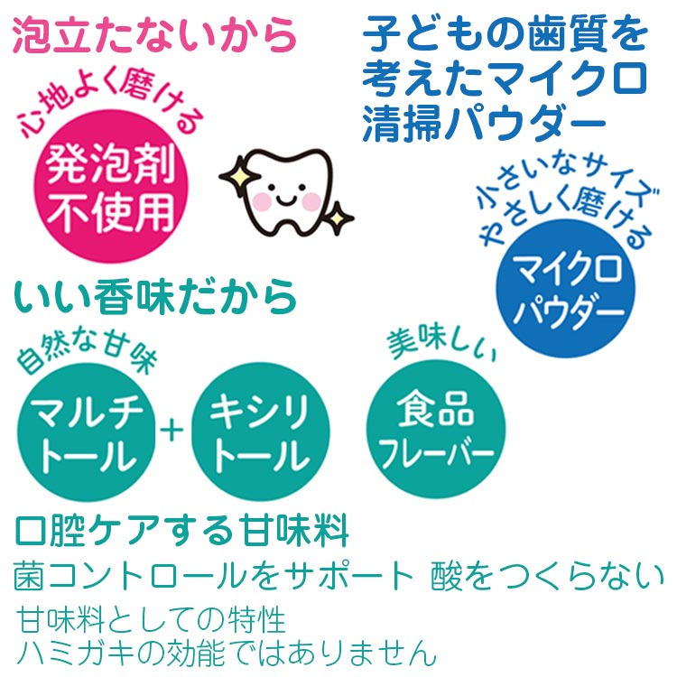 商品情報 発泡剤不使用で子どもの大好きな香味。磨いたときに違和感の少ないことが魅力です。子どもの歯質を考えたやさしく磨けるマイクロ清掃パウダーを採用し、口腔ケアする甘味料のキシリトールを配合。口に入れるものだから食品にも使われる成分で処方し、着色料や保存料は無添加。控えめな清涼感です。 エスケー石鹸 あわだたないこどもハミガキ ぶどう香味