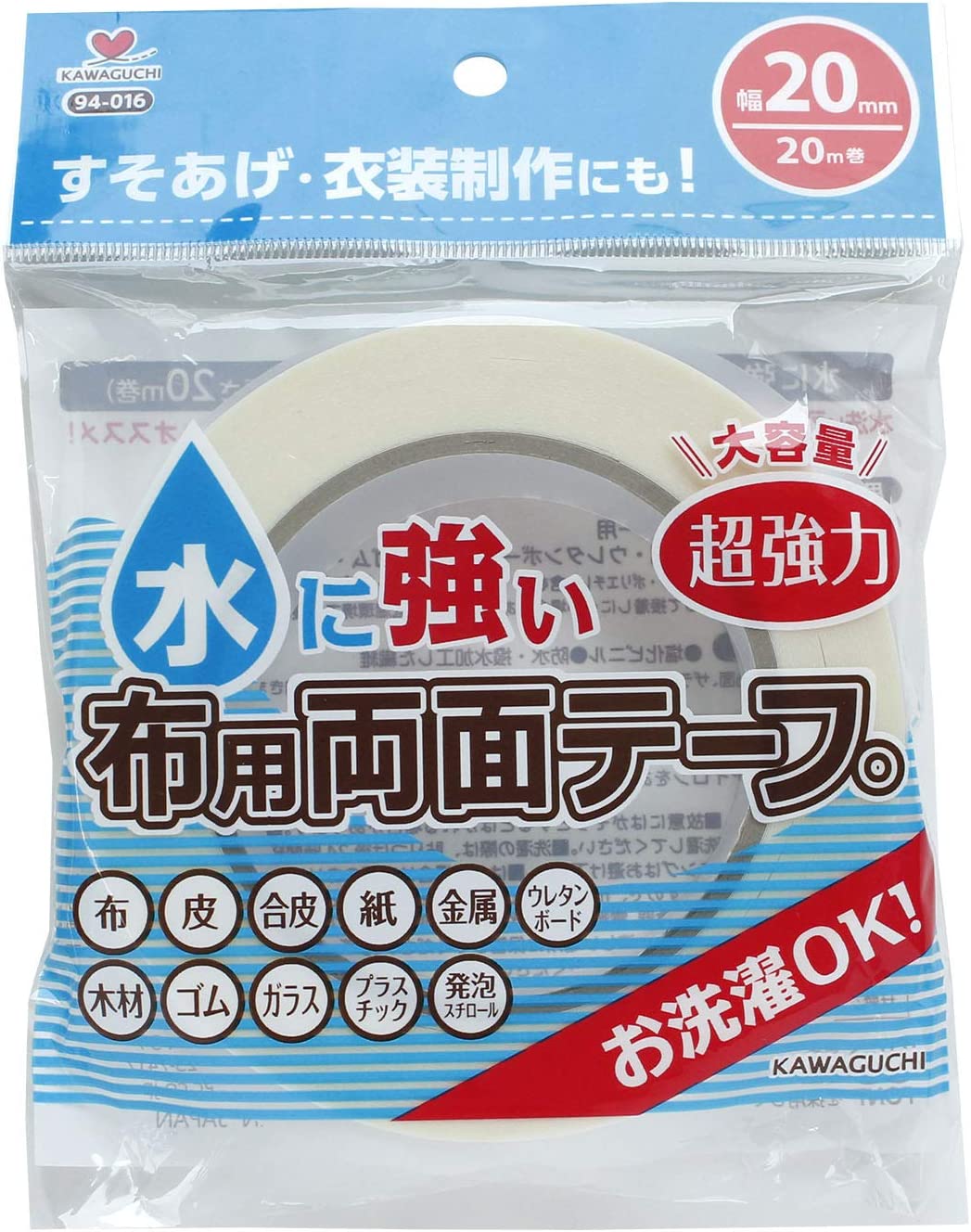 KAWAGUCHI 水に強い布用両面テープ 94-016 幅20mm×20m巻 大容量 超強力 洗濯OK