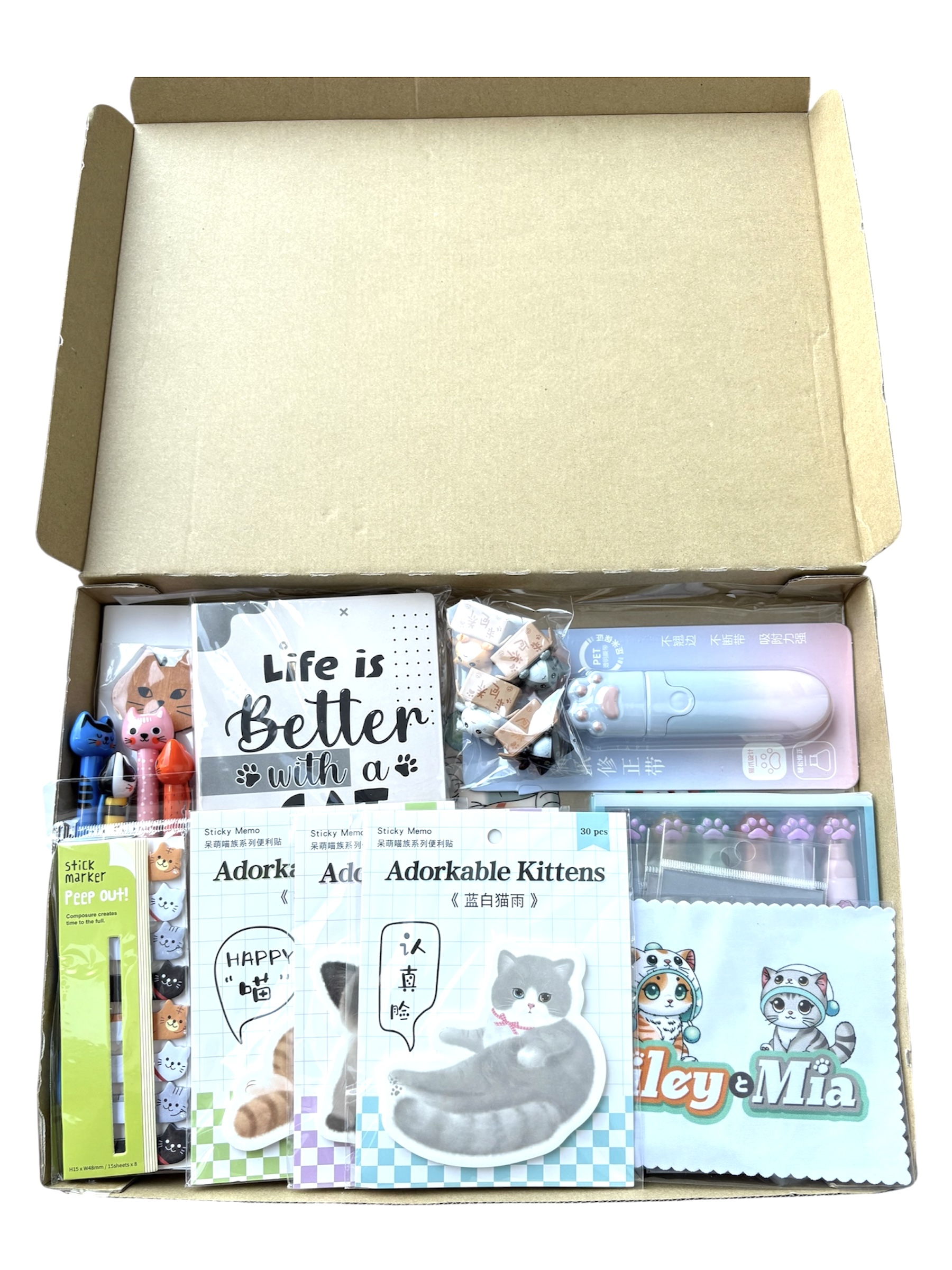猫好きさん必見!かわいい猫デザインの文房具がたっぷり23点入った豪華セットです。猫デザインボールペンや木製定規、プッシュプル消しゴム、便利なメモ帳や付箋、ステックマーカー、さらに修正テープや蛍光ペン、クリヤーファイル、クロス、ステッカーなど実用的でおしゃれなアイテムを揃えました。