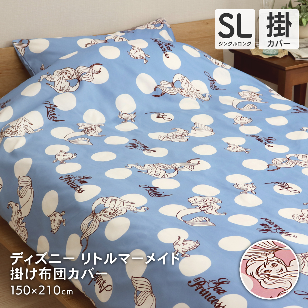 リトル・マーメイドの掛け布団カバーです。ドット柄の地模様に線画のアリエルやフランダーなどのキャラクターが描かれたデザインで、アリエル好きの大人はもちろん、お子様のお部屋にもオススメです。