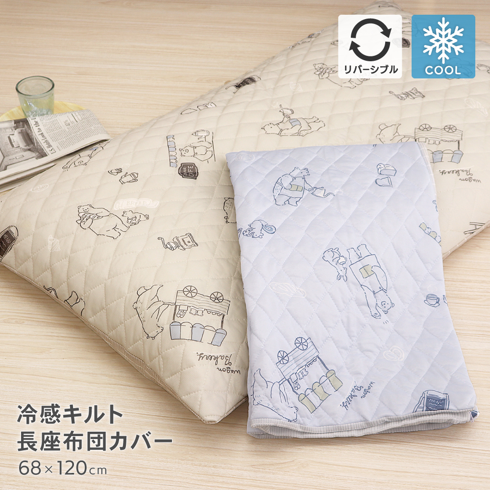 接触冷感キルト長座布団カバー 約68×120cm 裏面ニットワッフル リバーシブル クマ柄 動物柄 春夏用 カフェベア