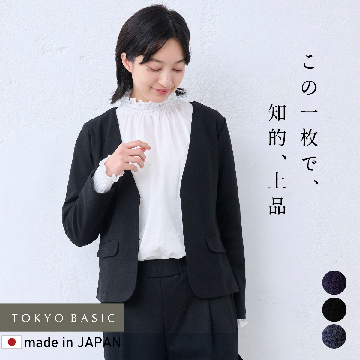 この一枚で、知的、上品なノーカラージャケット。よそゆきにも普段づかいにも映えるジャケットがあれば、あえて裏地を付けず、カーディガン感覚で。ウール産地尾州で特注のTBオリジナルの圧縮ウール。ウールに圧縮をかけて生地をフェルト化したので、なめらか手触り&上品な光沢感に。抜群の伸縮性でストレスフリーな着心地です。