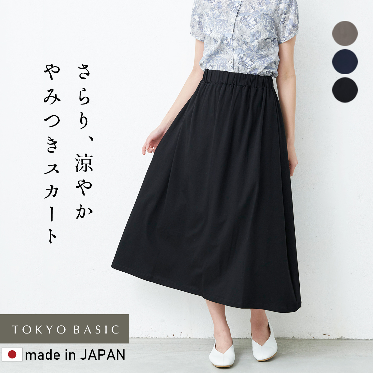 ひんやり、さらり、上品な光沢、上質な強撚コットンで差がつくシンプルスカート。コットン100%と思えない、光沢感とドレープ感で、ひんやりとした肌当たり、夏の定番素材強撚コットンで、シンプルなスカートを作りました。上品にきまる丈感で、流行に関係なく永く使える定番ロングスカートです。