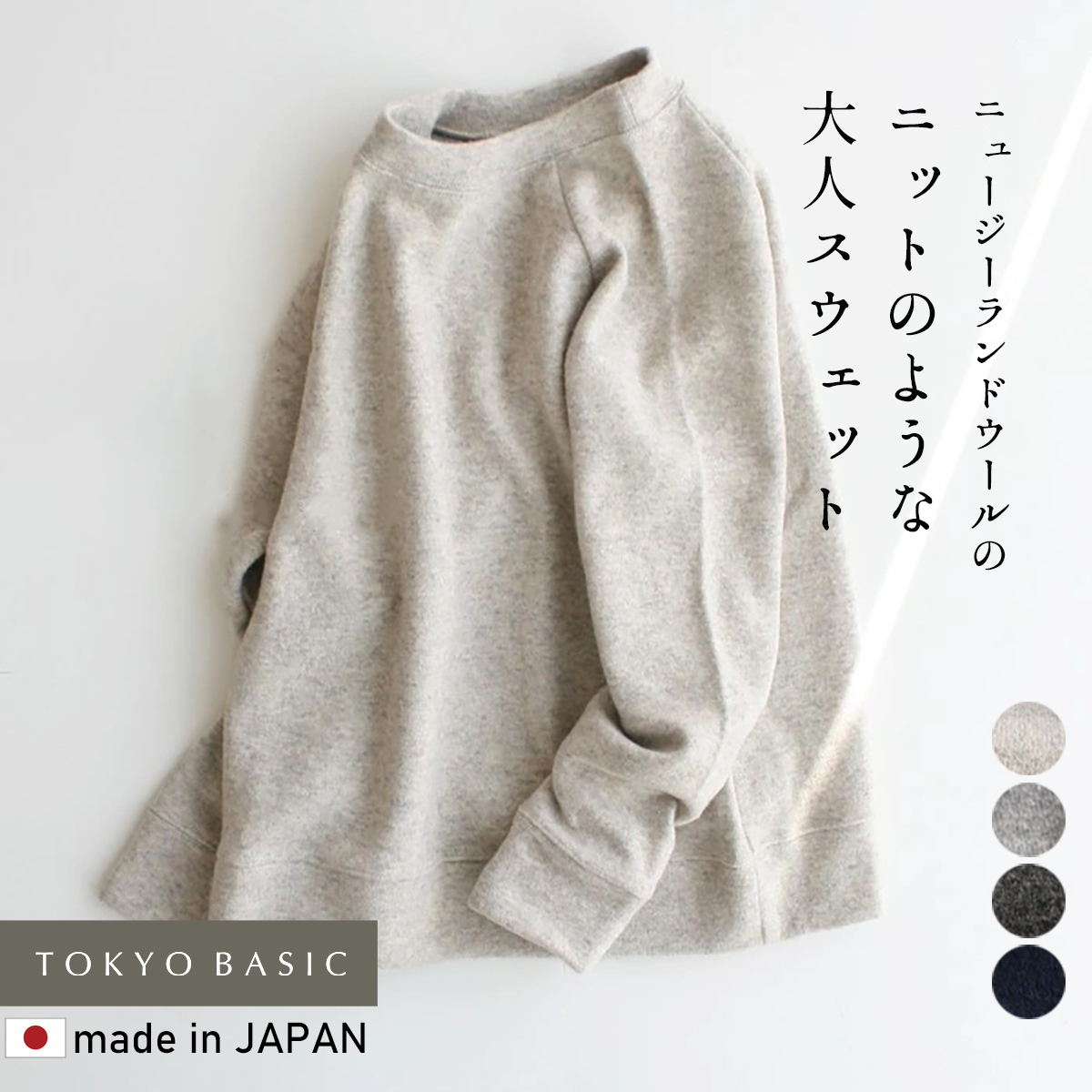 スウェットってカジュアル過ぎて子供っぽいイメージもあります。そこで、もっと上品で大人の着られるスウェットを作りました。表はニュージーランドウールでセーーターのような見え方。裏面はコットン100%のダブルフェースでしっかり肉感で暖かく、上品なイメージ。