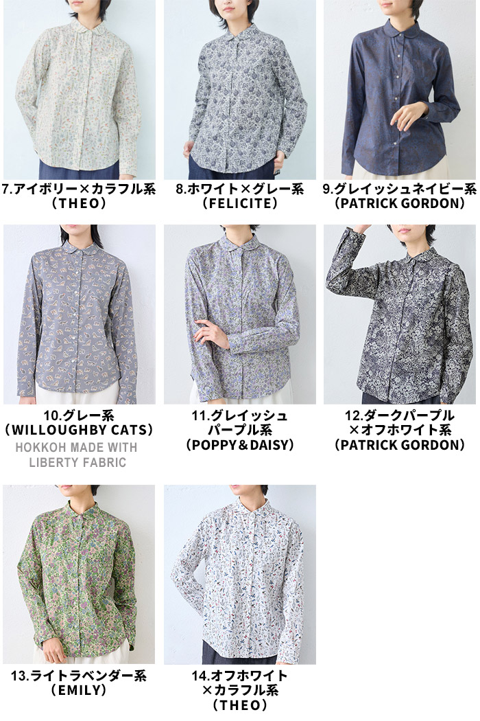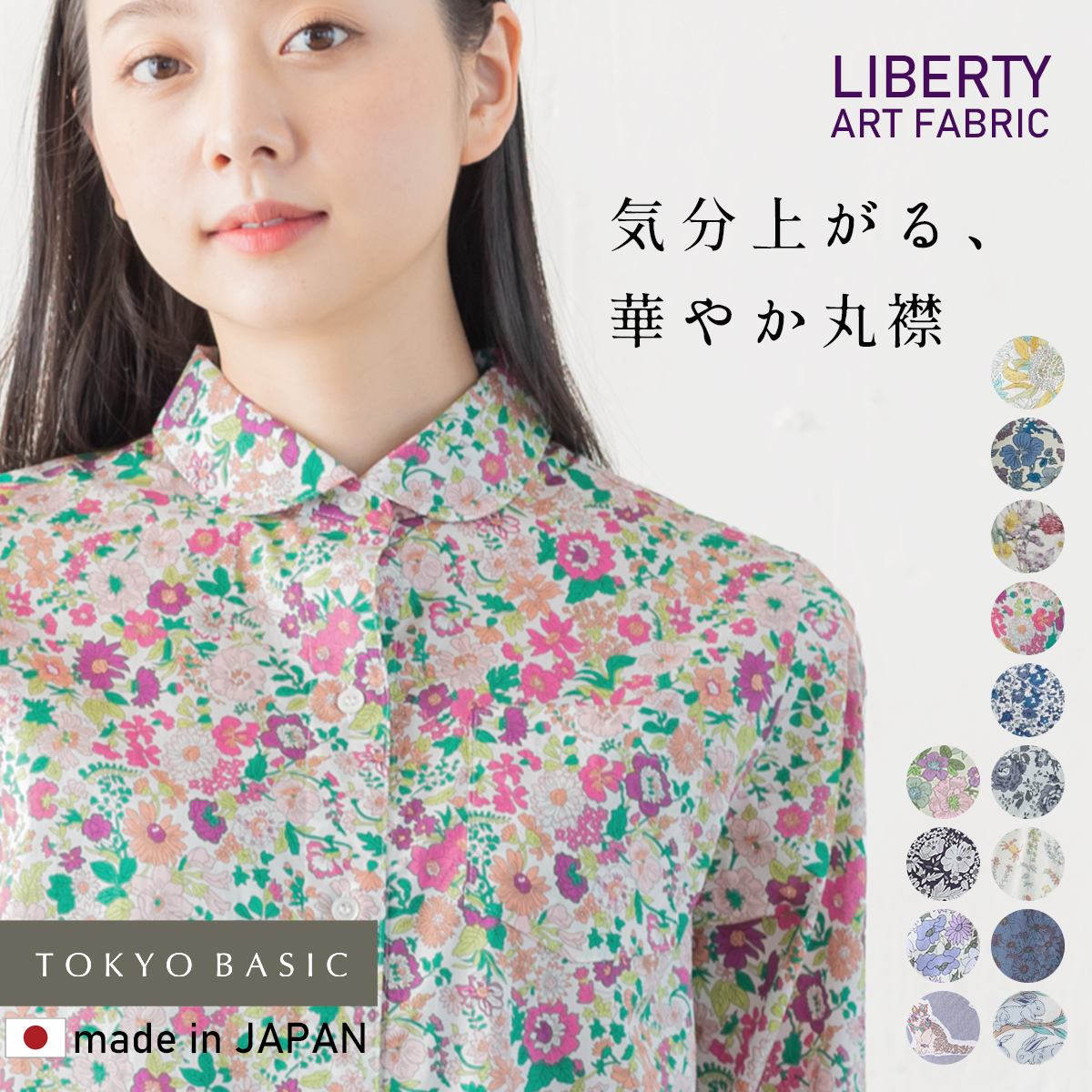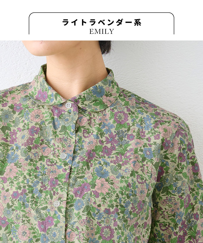 リバティ ブラウス 長袖 リバティプリント 丸襟 シャツ 日本製 40代 50代 60代 女性 ファッション レディース シャツ 丸襟 花柄 リバティー リバティ生地 タナローン liberty WILD FLOWER EMILY SMALL SUSANNA SWIM DUNCLARE パープル ブルー イエロー ネイビー