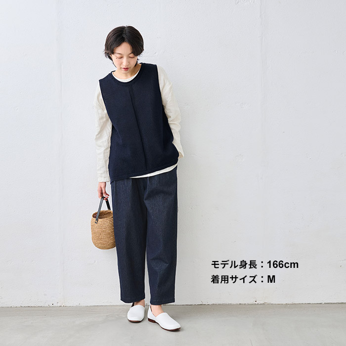 麻よりも麻らしいギマコットンだから、驚くほどさらりとした肌触り。風も通して涼しいニットです。編み出しの襟ぐりやセンターラインなどの細かなディテールもポイント。ゆったりとしたシルエットで、インナーによっていろいろな重ね着を愉しんでいただけるアイテムです。