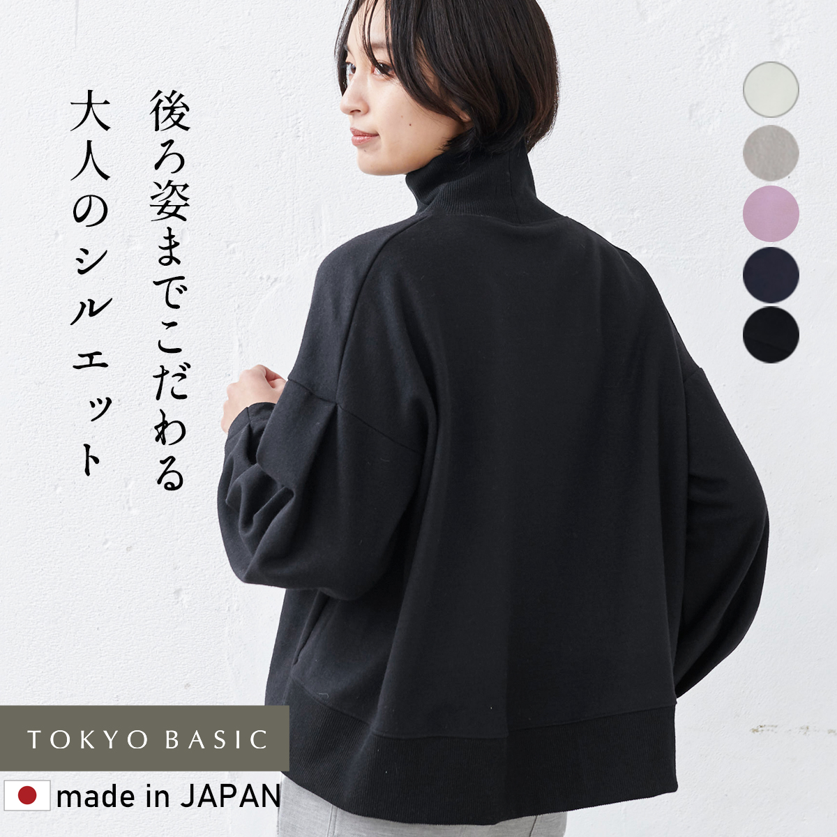 尾州産の圧縮ウールは、なめらかな質感で程よく光沢があるので、ラフになり過ぎず大人の装いに。首元と後ろの裾には、綿素材のリブをあしらい、チクチクが苦手な方にも着ていただける仕様に作りました。
