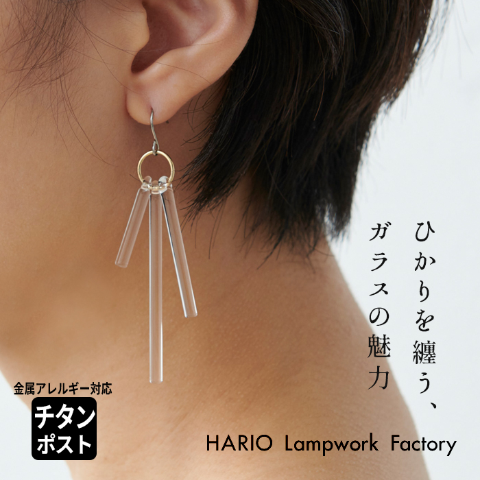 ひかりを受けて輝く、ガラスのアクセサリー。思わず見惚れてしまう、。繊細で美しい、ガラスのアクセサリー。ガラスの老舗HARIOの職人さんがひとつひとついのちを吹き込んだアクセサリーたちは、唯一無二の輝きを放っています。涙型の小さなガラスが3つ並んだ「リトルテ3本のガラススティックが揺らめく「カナデ」は、まるで楽器のチャイムのようなかたちで、ロッドが揺らめき音を奏でそう。