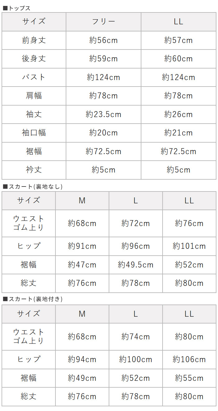 サイズ トップス:フリー・LL、スカート:M・L・LL