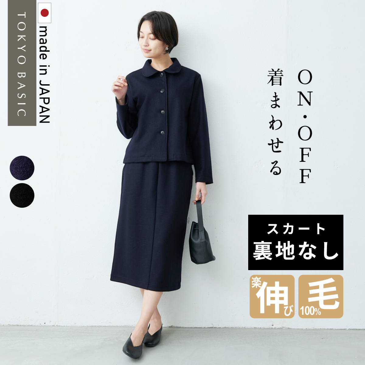 上質な素材と定番のデザインであれば、パールやコサージュなど少しの小物を身に着けるだけで大人のフォーマル顔に仕上がります。ウールの産地尾州でと特注した圧縮ウールは、抜群の伸縮性で、フォーマルな場もデイリーもストレスフリー。