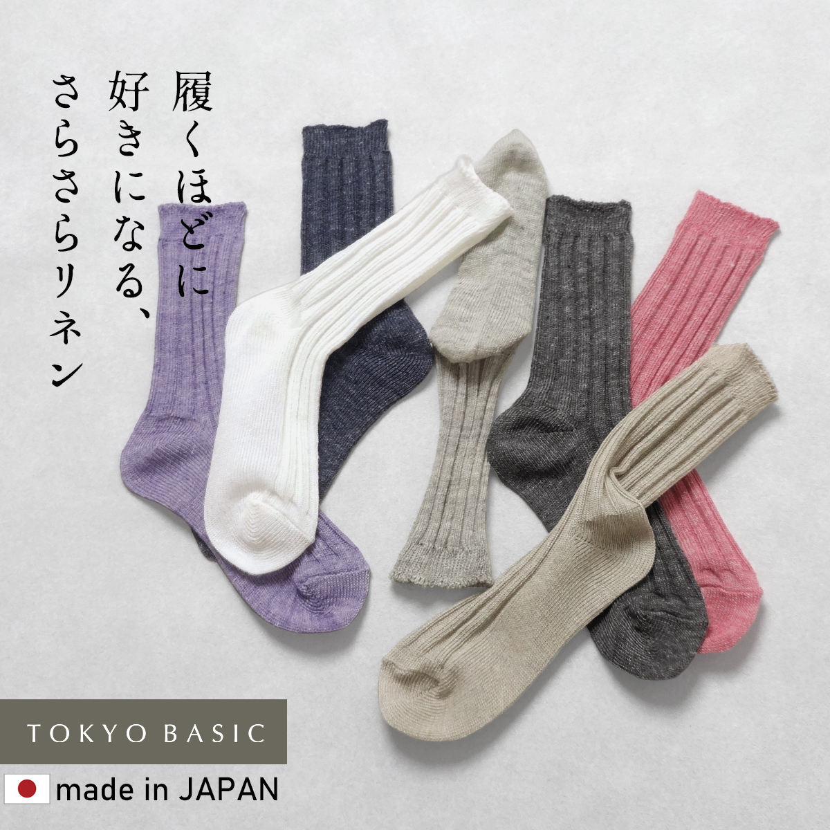 このさらさら感、履くほどに、どんどん好きになる。快適なリネンアイテムを数々販売してきたTOKYO BASICが満を持してつくりました。さらさら快適なリネンを足元にも。一年中汗をかく足元だからこそ、吸湿性、速乾性に優れているリネンの良さを感じていただけます。靴下産地の奈良で七十年以上続く老舗の工場さんが編み上げたこだわりの日本製靴下は、ざっくりとした編地のリブ目で、履くほどに馴染んでくれます。tokyobasic TOKYO BASIC 東京ベーシック