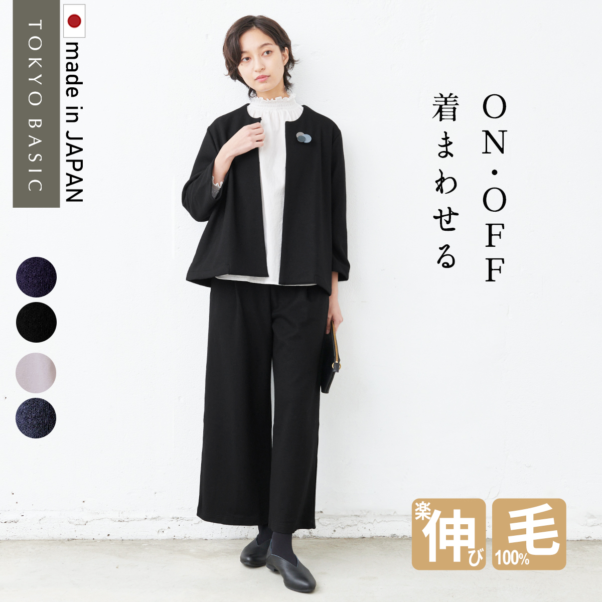 ON、OFF着まわせるフォーマルセットアップ。私たちは、きちんと感を演出しながら、デイリーに使え、着まわしがきくフォーマル服を作っています。上質な素材と定番的なデザインであれば、パールやコサージュなど少しの小物を上手に身に着けるだけで、フォーマル顔になります。