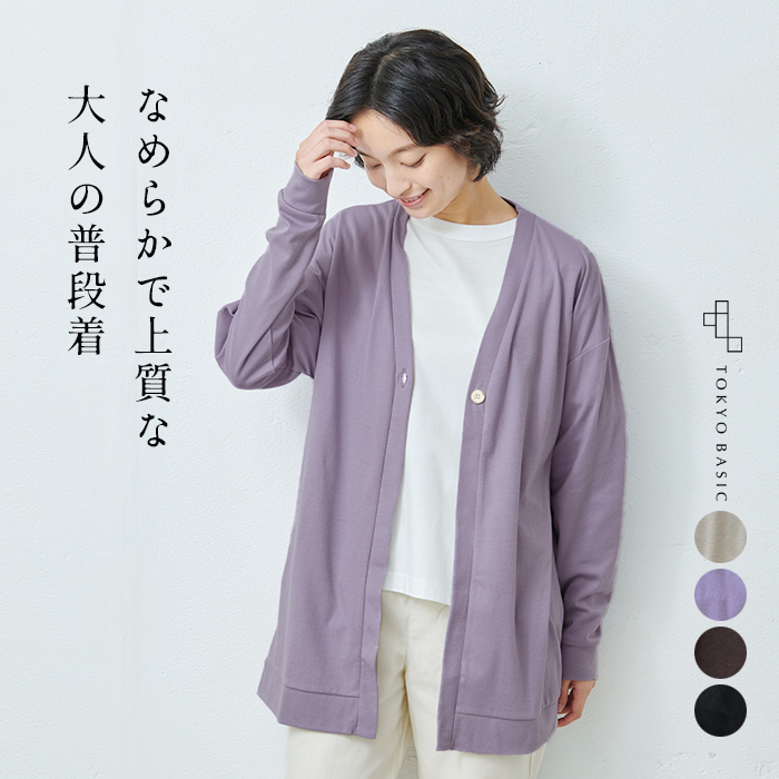 なめらかで上質な大人の普段着。肌にしっとりと馴染む、上質なフェザーニットコットンにゆったりと包み込まれる、大人の普段使いカーディガン。滑らかなドレープ感が大人の品を演出してくれます。肌寒い時、コーデを少しエレガントに仕上げたい時、サッと羽織れて心地よい、ついつい手に取ってしまう、そんな大人向き優秀カーデです。