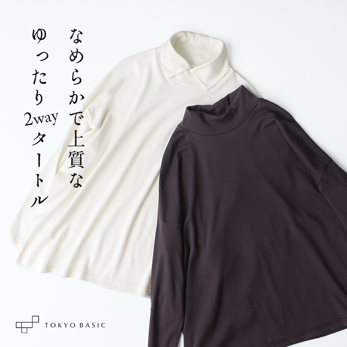 襟付き、タートル、二通り楽しめる大人のデイリー服。肌にしっとり馴染む上質なスムース素材。大人気「ふわふわコットン2WAYタートル」に一枚でも着映えする、ゆったりシルエットが登場。クラシカルな印象の小さな襟は、内側に折り込むとハイネック仕様にも。羽の様にやわらかく、しなやかな心地よい生地感なので、着心地にこだわる方にも満足していただける一枚です。