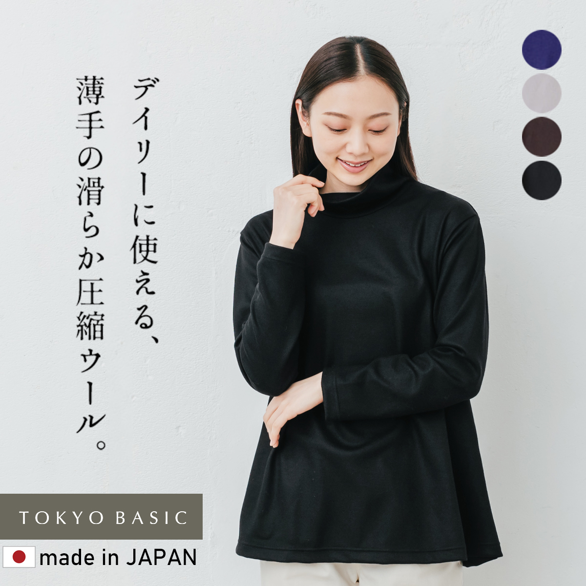 おうちで洗えて、滑らかな肌触りの薄手圧縮ウール。TOKYO BASICの定番「圧縮ウール」より薄手で肌触り滑らかな新素材。程よい光沢感とドレープ感がキレイに表現されるプルオーバーなので、品のある大人の装いに仕上げてくれます。