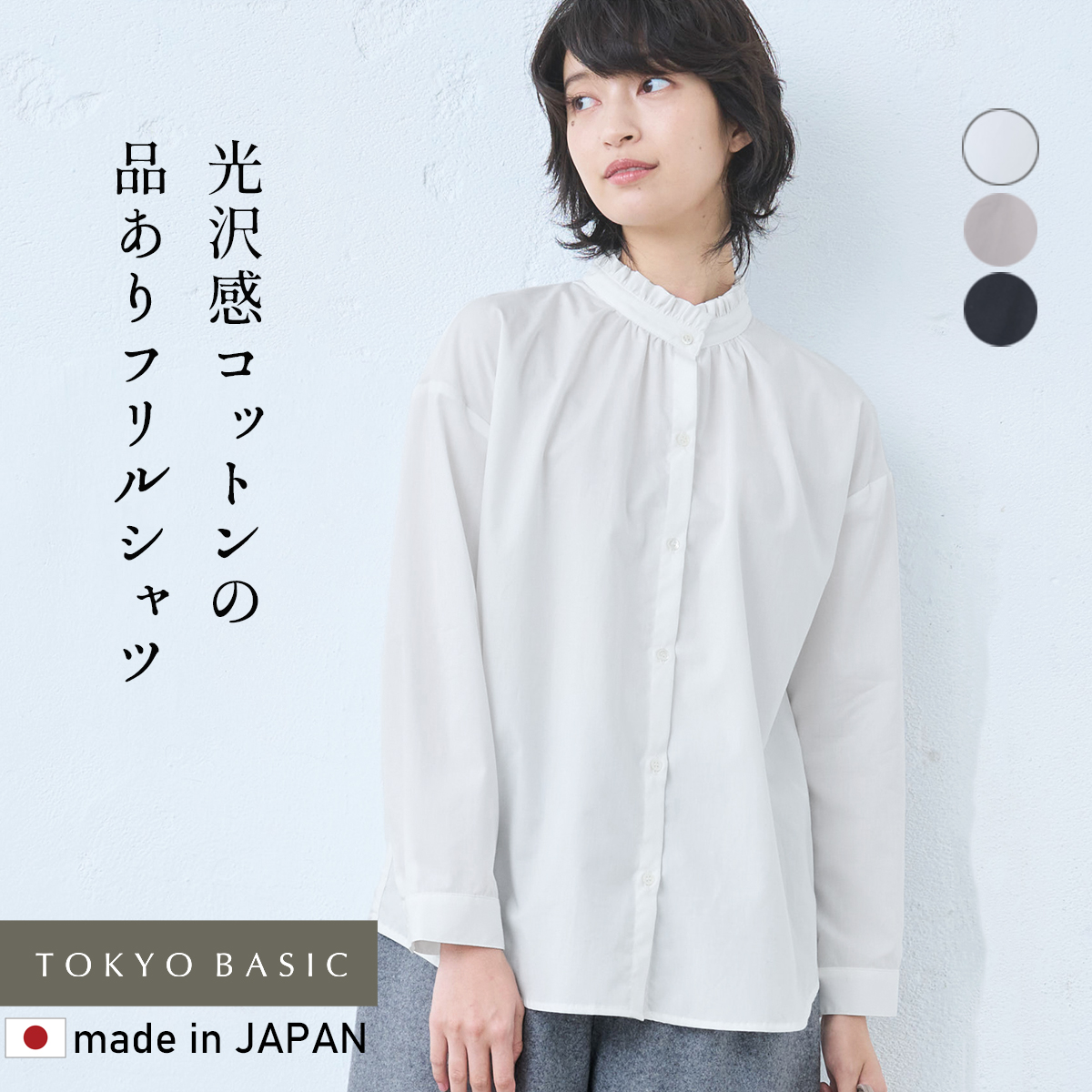 立ち襟フリルブラウス 50代 フォーマル コットン100% ブロード フリルシャツ 日本製 シャツブラウス