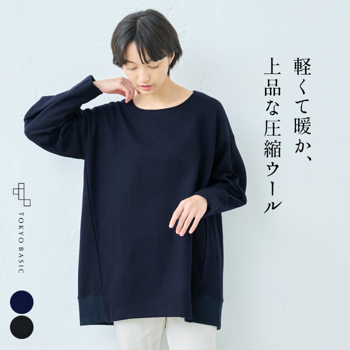 秋冬の定番素材、軽くて暖かい、「尾州の圧縮ウール」のチュニック。袖のタックと、裾のリブ使いが、大人に似合うシルエットを作ります。カジュアルなボトムと合わせて普段使いにも、同素材のボトムと合わせてセットアップも楽しめます。きれいめの小物と合わせると、フォーマルにも着まわせる一枚です。