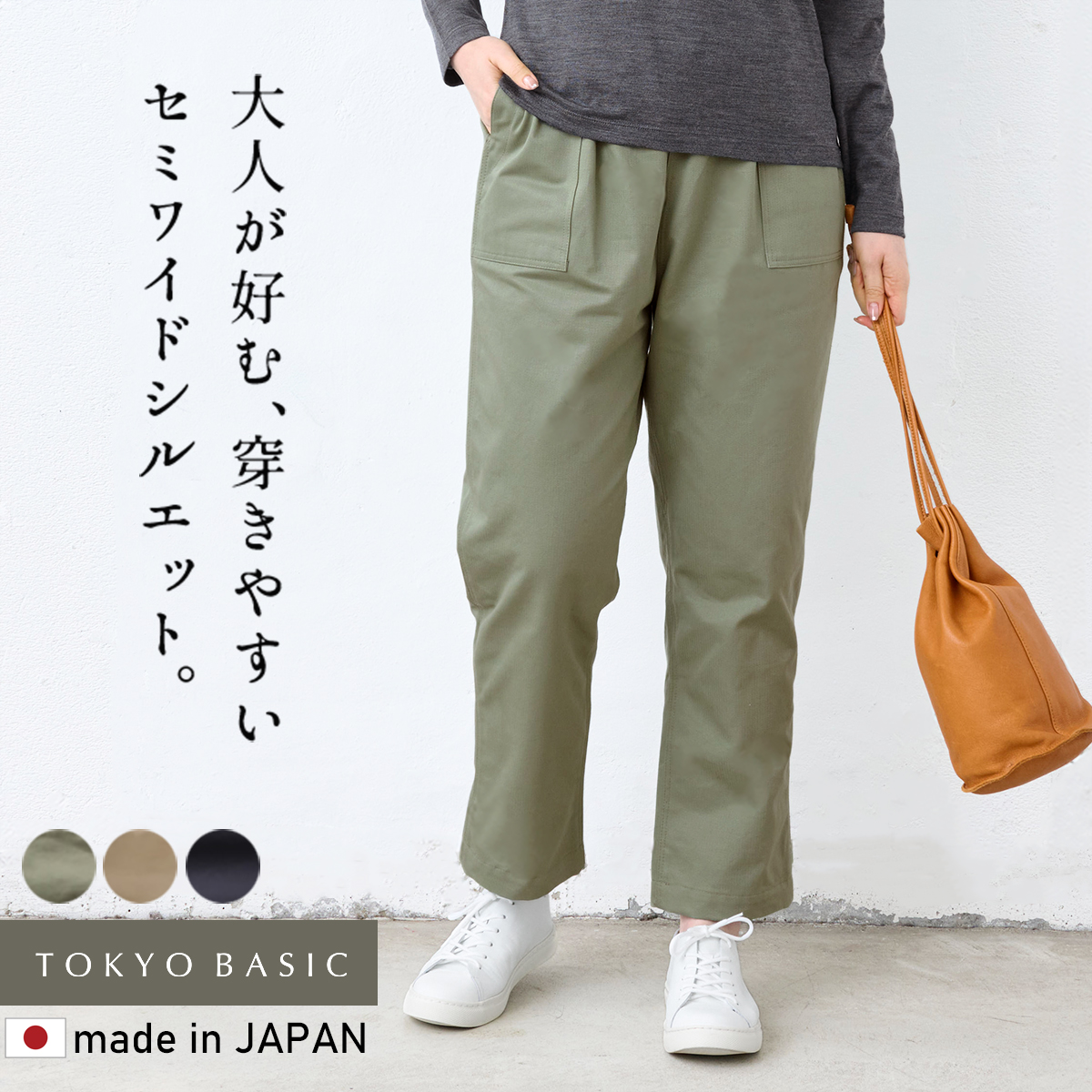 大人が好む、穿きやすいセミワイドシルエット。上品な生地感と程よいゆとりシルエットの大人に嬉しいベイカーパンツ。定番のベイカーパンツより少し太めでゆとりのある、人気のセミワイドシルエットのベイカーパンツを作りました。しっかりとしたハリがあり、程よい光沢感のある生地は、カジュアルになり過ぎず、大人のデイリーコーデに馴染むアイテムに仕上げてくれています。