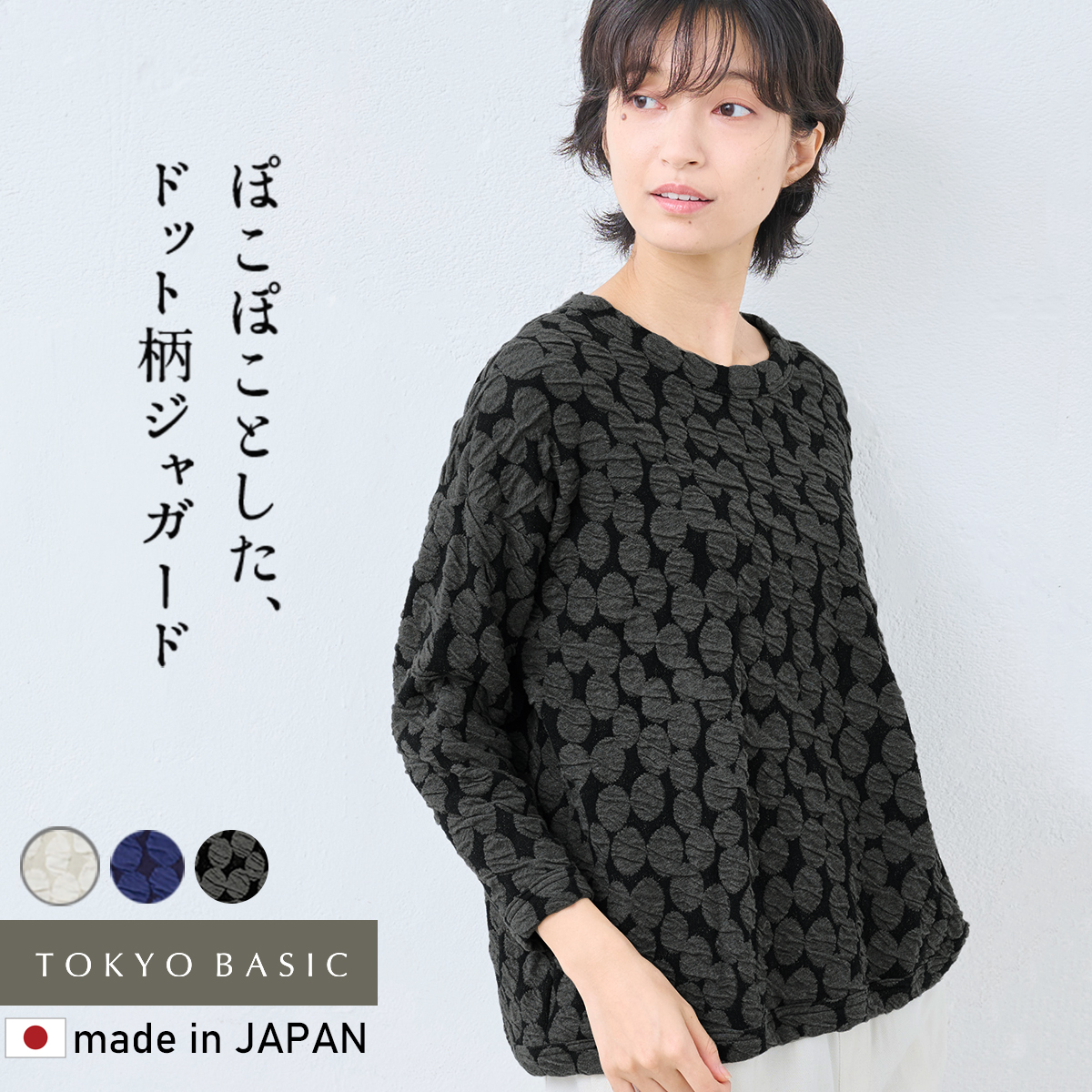 ぽこぽことした立体感のあるドット柄ジャガードのトレーナー。柔らかな肌触りで伸縮性があり、ゆったりとした着心地です。体のラインを拾わないシルエットと、ランダムなドット柄が大人ナチュラルな印象に。秋冬から春先まで長く着られるコットン混素材。1枚でも重ね着でも楽しめる日本製トレーナーです。