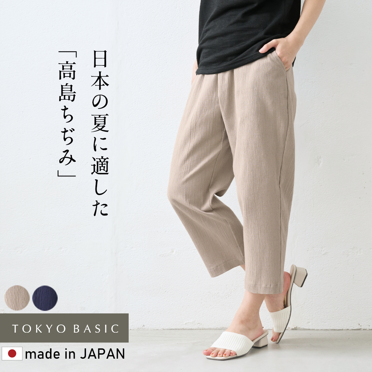 江戸時代より日本の涼を支え続けている「高島ちぢみ」は、さらりとした肌触りと優れた吸湿性で、高温多湿な日本の夏に適した素材です。涼やかなクロップド丈のパンツは、お家でのリラックスタイムはもちろん、ちょっとそこまでの外出にも着回せます。汗をかいても肌にはつかず、べとつかないから快適な着心地で、暑い季節も涼しく過ごせる一枚です。